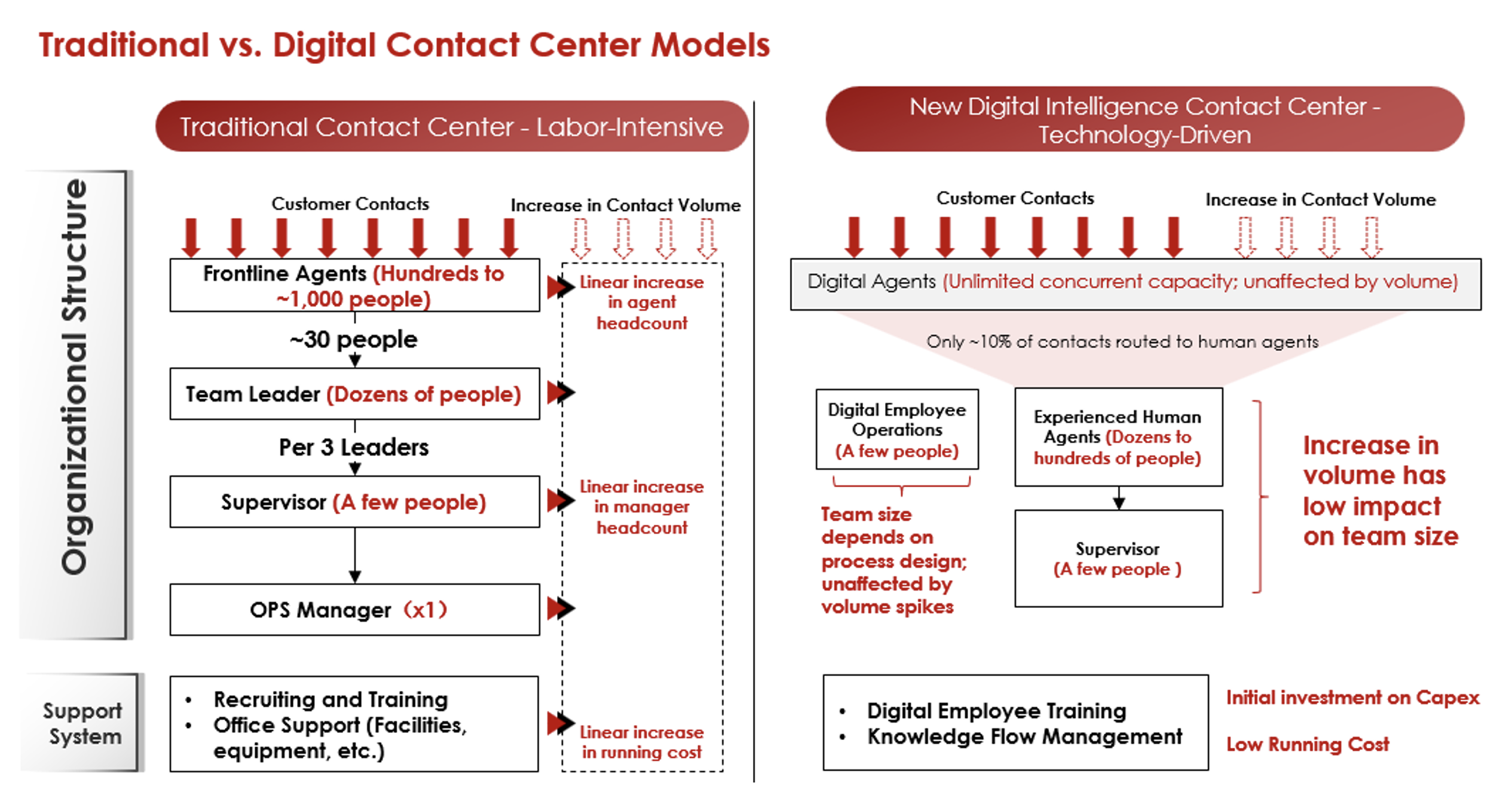 Traditional Model: The Linear Trap. In the traditional labor-intensive model, headcount is determined directly by expected contact volume. As orders and store visits grow, the number of frontline human agents must increase linearly. This creates a compounding hierarchy where every cohort of human agents requires team leaders and supervisors, causing labor costs and organizational complexity to rise in lockstep with demand.